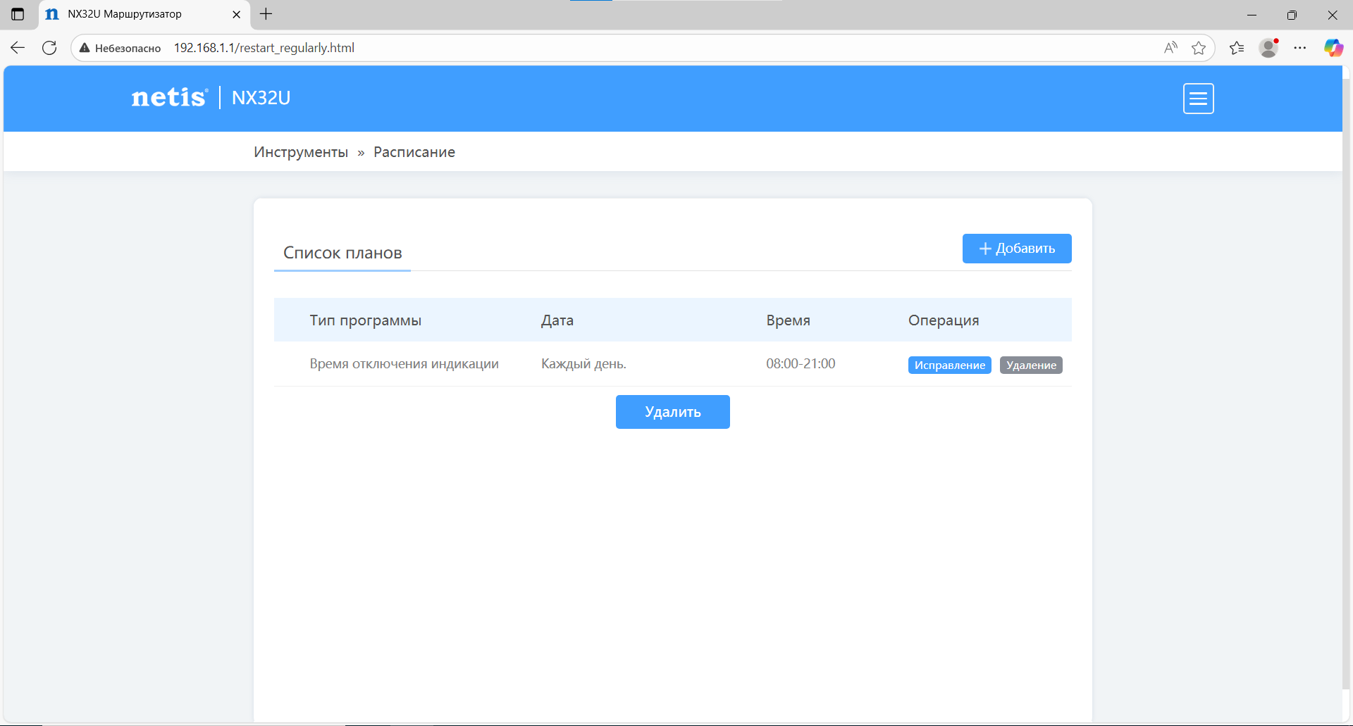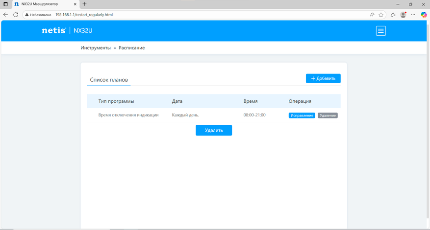 В разделе доступно расписание, позволяющее автоматизировать отдельные функции, например, отключение индикаторов состояния роутера в заданное время, например можно отключить индикаторы в ночное время.
