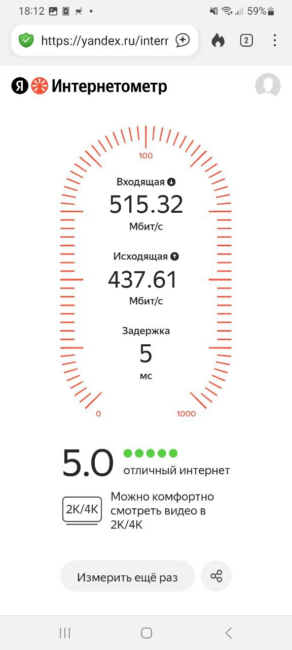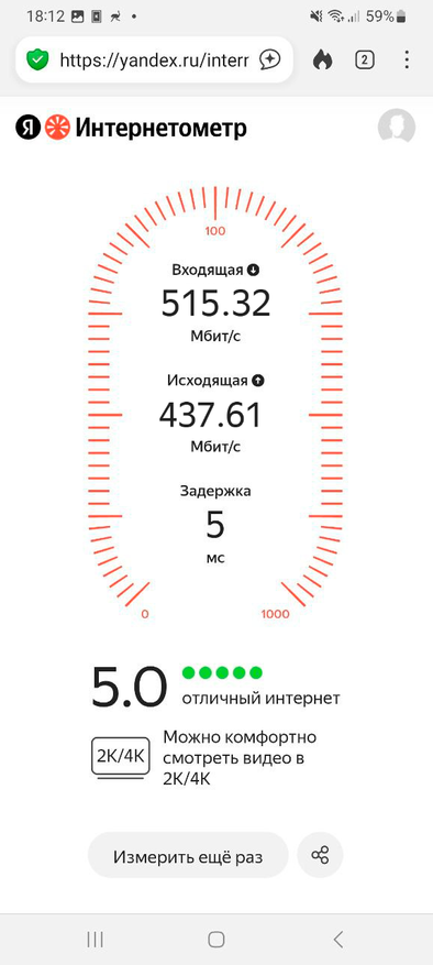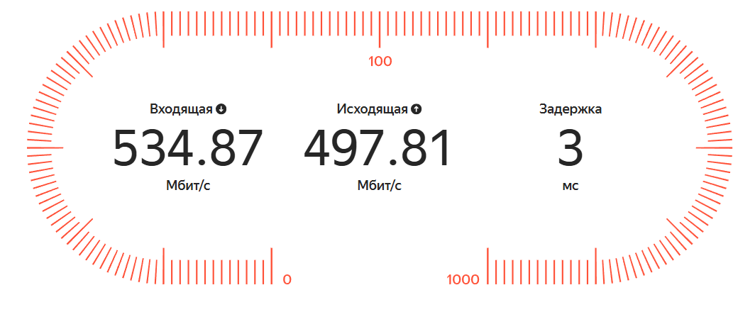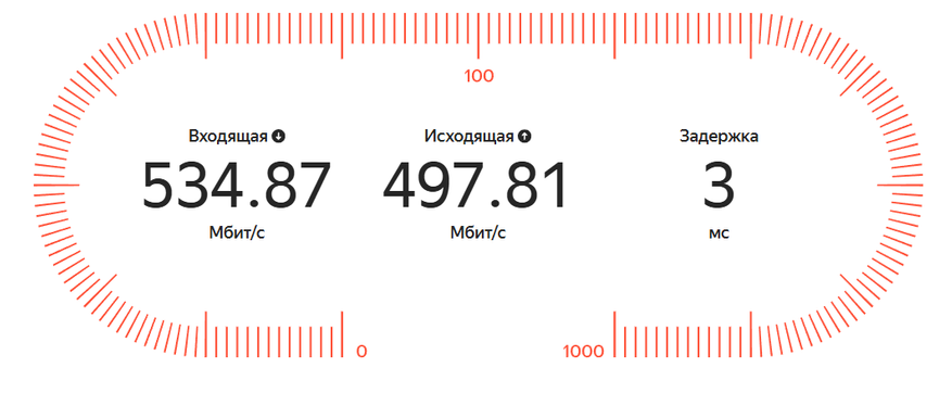 Скорость моего тарифа ограничена 500 Мбит, но в ходе нескольких повторных тестов соединение показало стабильную работу: проводное подключение держалось в пределах заявленных провайдером значений, а результаты по Wi-Fi отличались лишь в пределах погрешности.