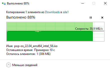 На Windows нужно активировать компонент SAMBA, если он не включен. В качестве теста, перекидывал файлы объёмом ~5 ГБ, скорость показало в районе 40 МБ/с.